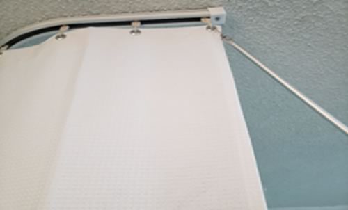 Tela: Fabricada en tela 100% poliéster impermeable color blanco en la cara exterior. 50% poliéster y 50% algodón color blanco en la cara exterior. Unión de las telas con velcro por la parte posterior. Bastón de 1.50 m, con aro de inferior de plástico. Arrastre de 2 cm sobre el nivel de piso terminado.